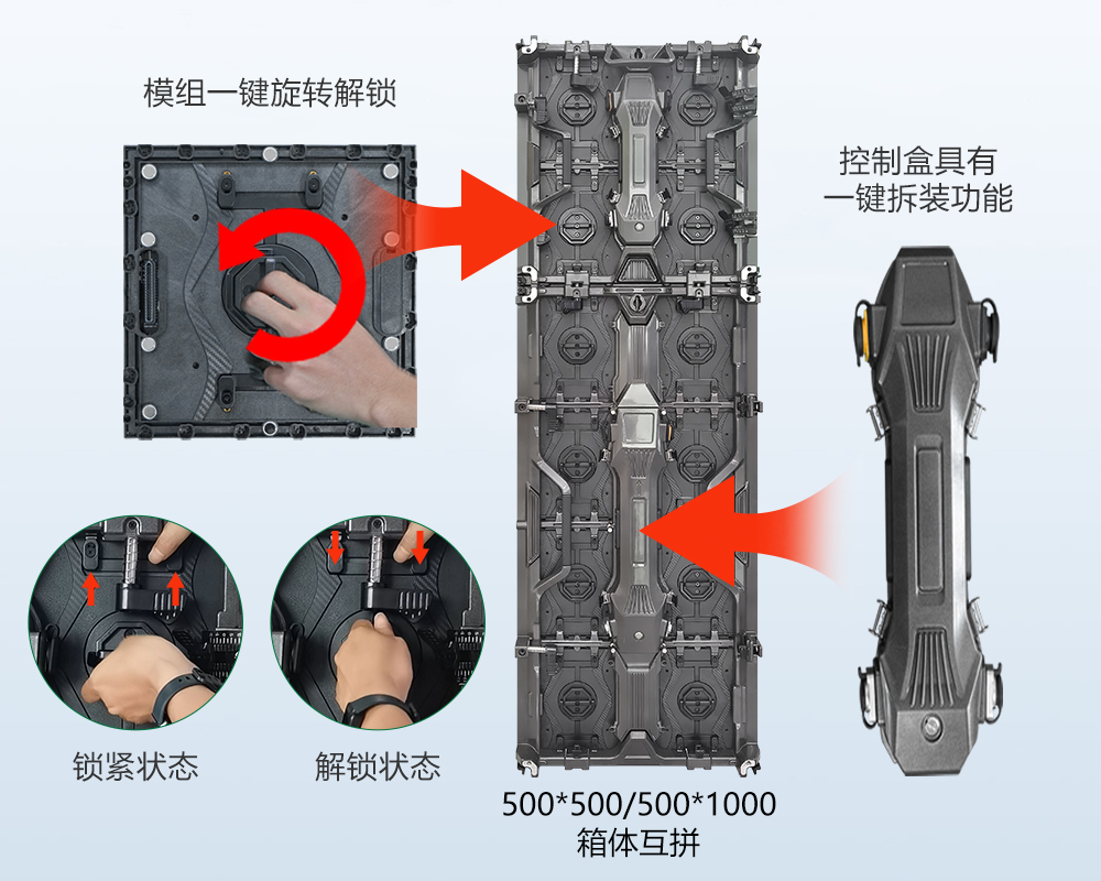 如上面所说,大量的箱体拆装是个具有挑战性的工作,需要LED屏具有快速拆装的设计,C-Shine-plus的模组和控制盒都具有一键拆装功能,500*500和500*1000的箱体还可以互拼。